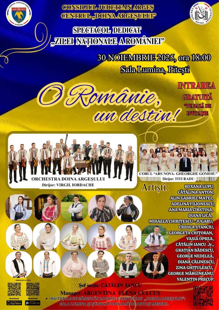 Centrul „Doina Argeșului” organizează un spectacol cultural dedicat Zilei Naționale a României, care va avea loc pe 30 noiembrie 2025, de la ora 18:00, în Sala Lumina din Pitești. Evenimentul, intitulat „O Românie, un destin!”, are intrarea liberă.